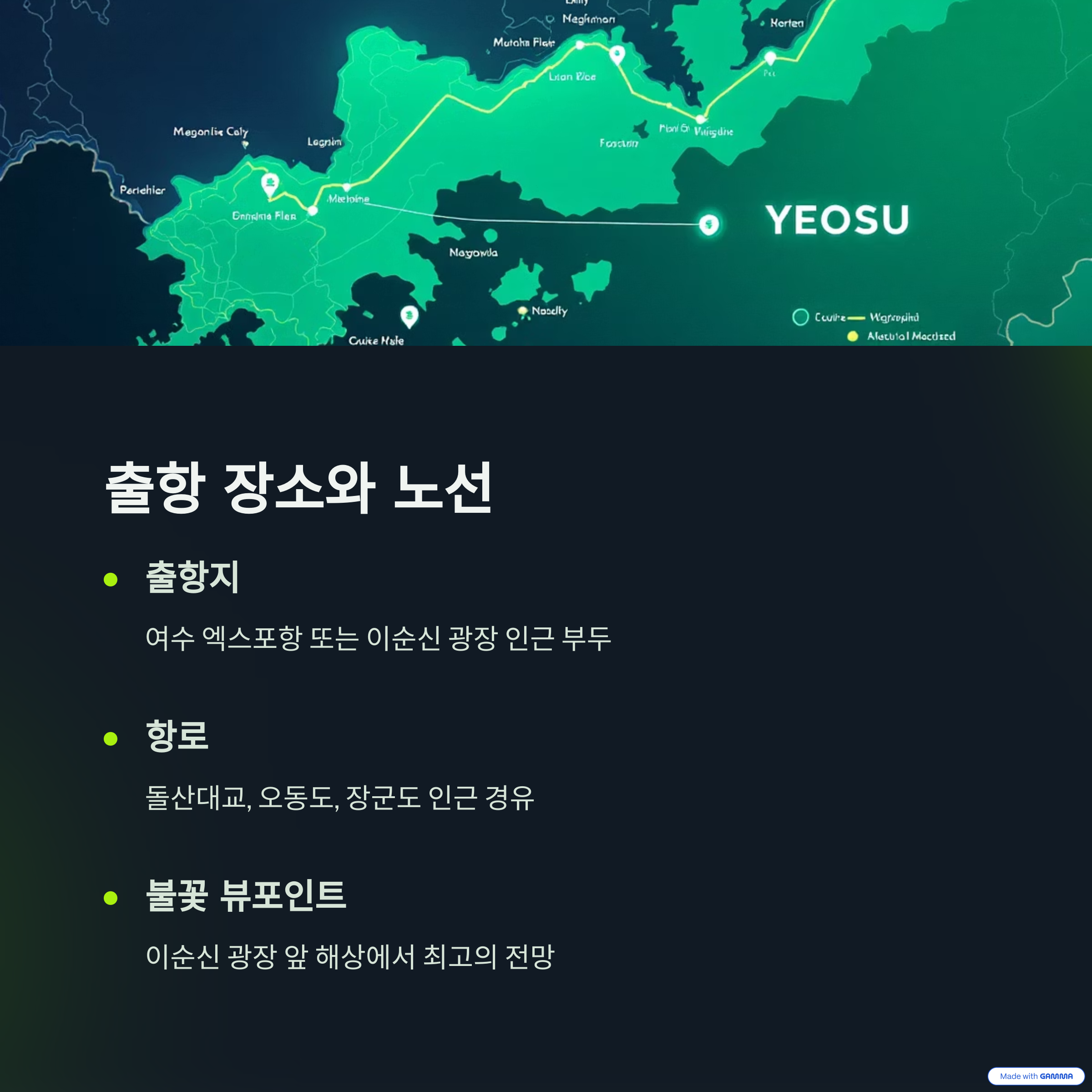 항로는 여수 밤바다의 명소인 돌산대교, 오동도, 장군도 인근을 경유하며