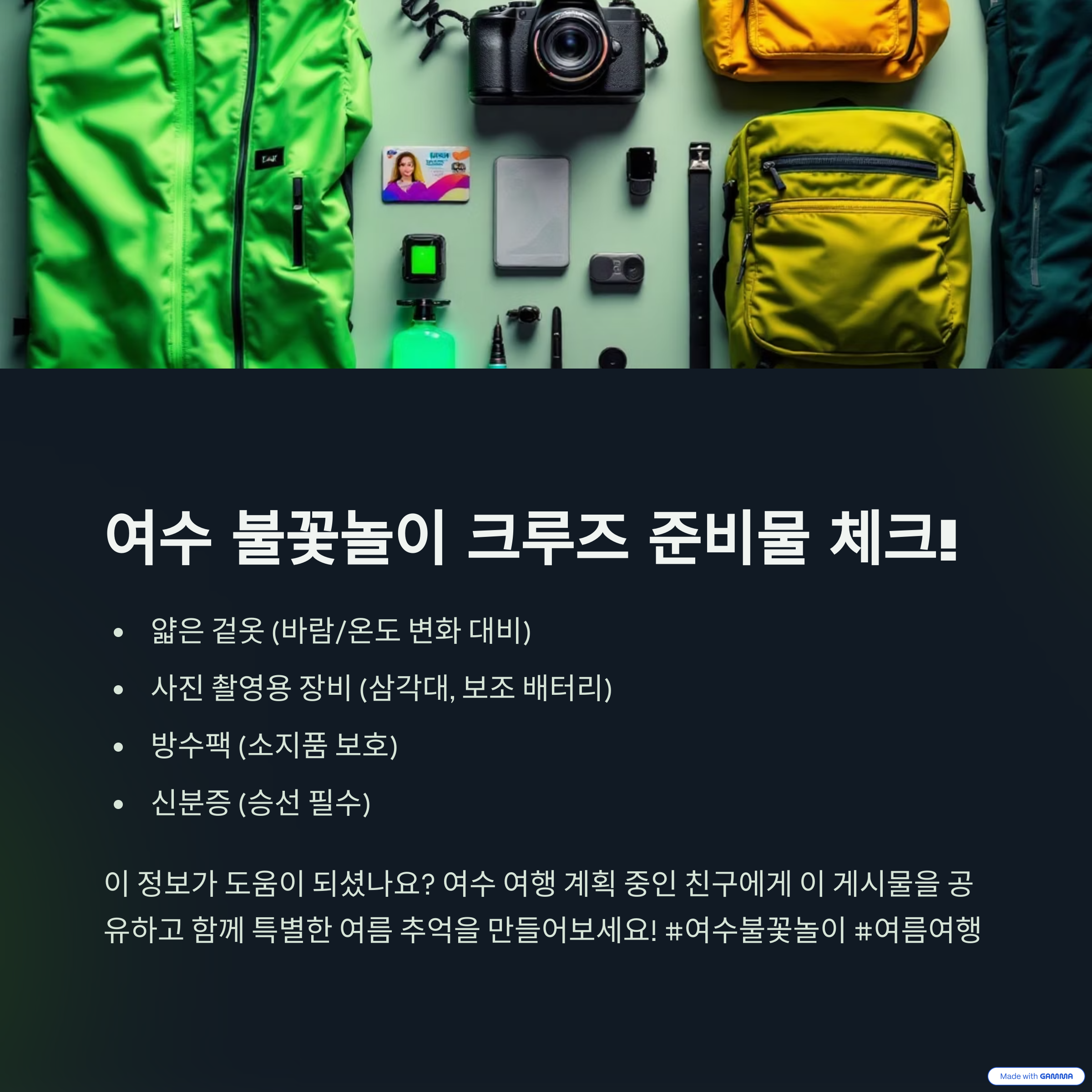 사진 촬영을 위한 삼각대, 보조 배터리, 방수팩 등도 유용하며